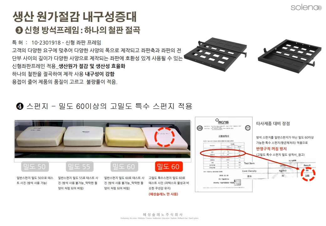 방석 스펀지를 일반스펀지가 아닌 밀도 60이상 가능한 특수 스펀지(항균제처리) 적용으로 반영구적 꺼짐 방지